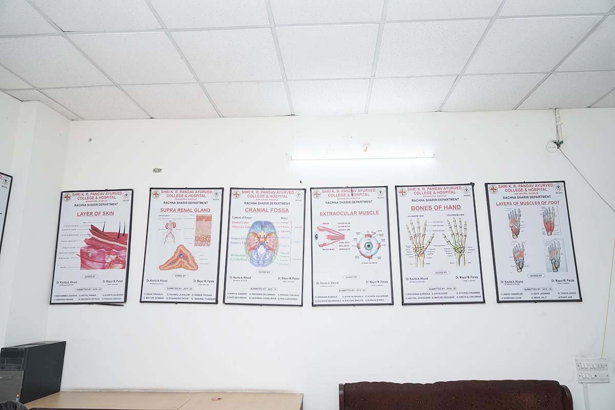 Here the students along with theory study Human body parts through dissection methods and become an open-minded researcher and an intelligent clinician. This department is equivalent to that of Anatomy of modern medical science and it deals with anatomical aspects of the human body including histology, osteology, organology, etc. The Rachana Sharir subject comprises study of Normal body structures documented by Ayurveda and the Acharyas as well as the study of Modern Anatomy.
